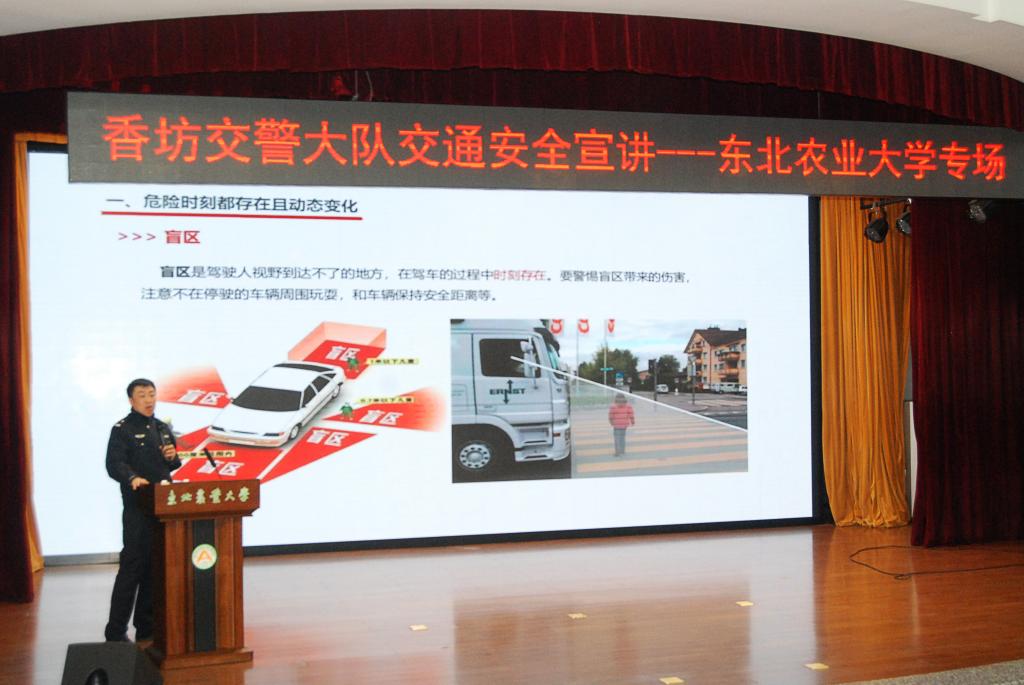 为进一步增强广大师生的交通安全意识,严防交通事故,打造平安东农,3月27日,香坊区交警大队应邀来我校进行交通安全主题宣讲。本次活动得到香坊区交警大队、市交警大队宣传处大力支持,香坊区交警大队副大队长刘超、宣教科科长赵劲松、我校保卫处全体工作人员参加了宣讲活动,宣讲活动由市交警大队宣传处吴巍警官主讲,保卫处副处长王春辉主持,我校师生代表400余人参加了宣讲。