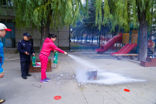 随后,保卫处工作人员现场演示了几种灭火器的使用方法,并指导幼儿园教师如何使用消防设施。