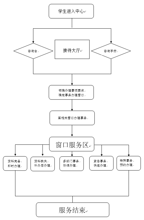 学生来到中心后,通过设置于接待大厅的咨询台、咨询手册,明确所需办理相关事宜的具体要求。然后至相关窗口办理事务。中心坚持“即办件当场办理、承诺件限时办理、联办件协调办理、急办件快速办理、退回件明确答复、特殊事务预约办理”的运作模式,为学生提供高效便捷的服务。窗口服务结束,学生可对中心工作人员的服务做出评价。对于新生入学、毕业生离校等学生服务需求紧张的重点时段,中心将出台应急预案,规划临时应急场所,以满足需求。